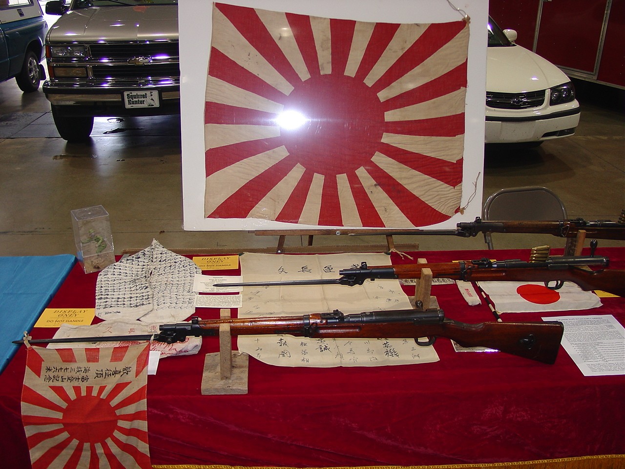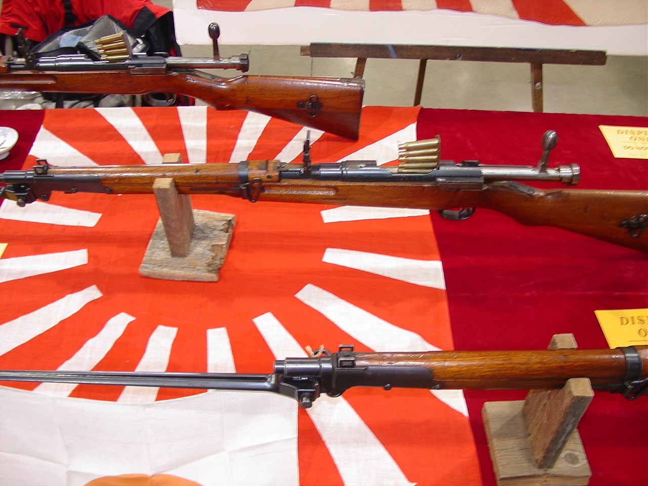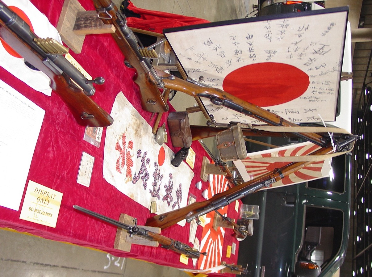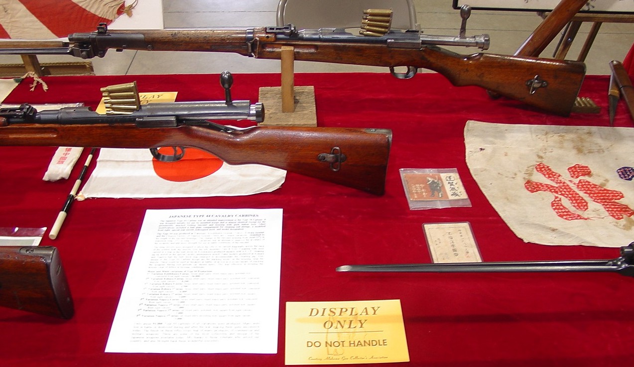 Japanese Type 44 Cavalry Carbines, other military items and accessories in use by the Japanese during World War II. Pictured are all basic variations and models of Type 44 Carbines. These aren't pictures of the finished display but were taken during a break while setting up. Clicking on a picture will open it full size in a new window.