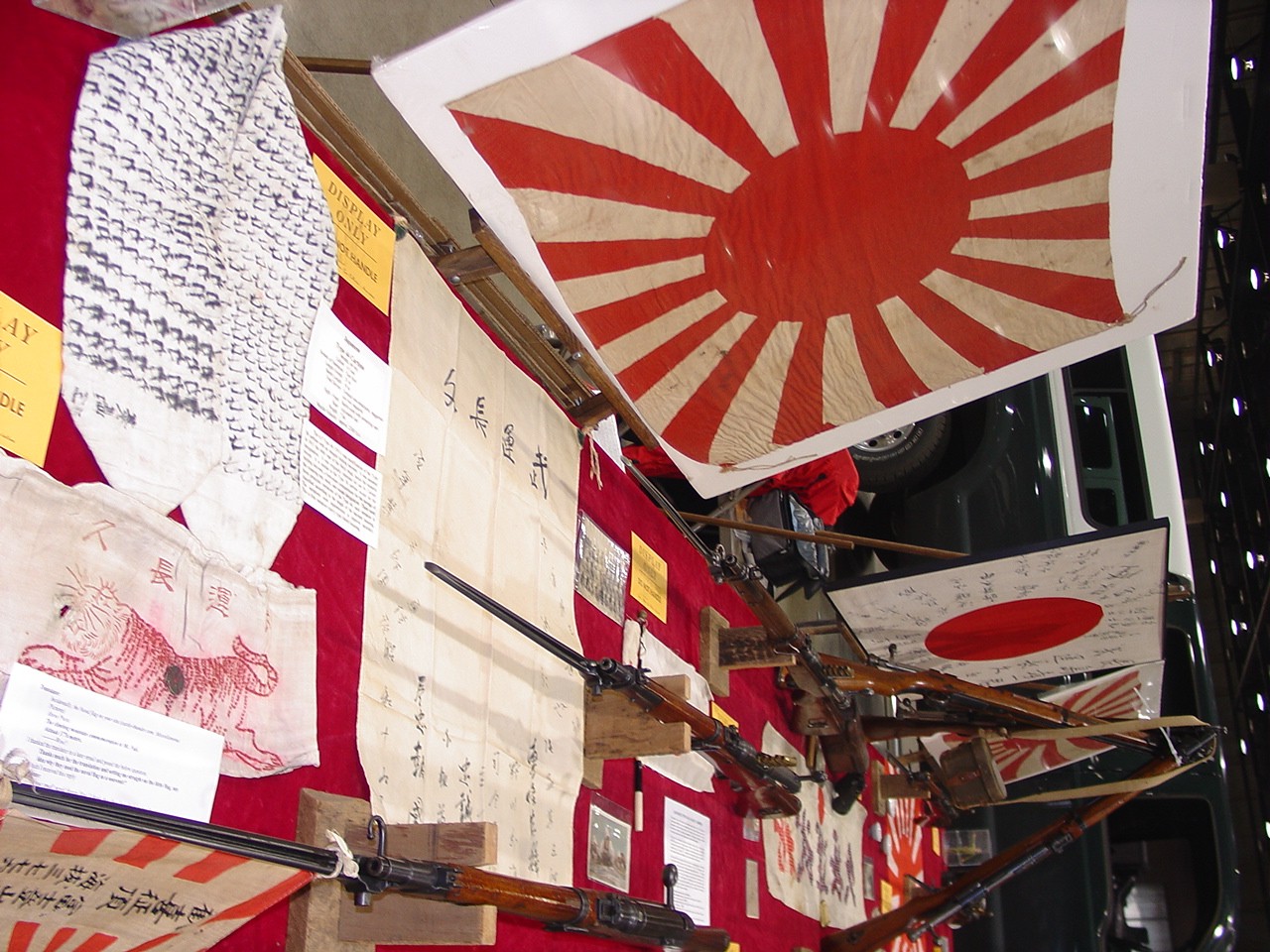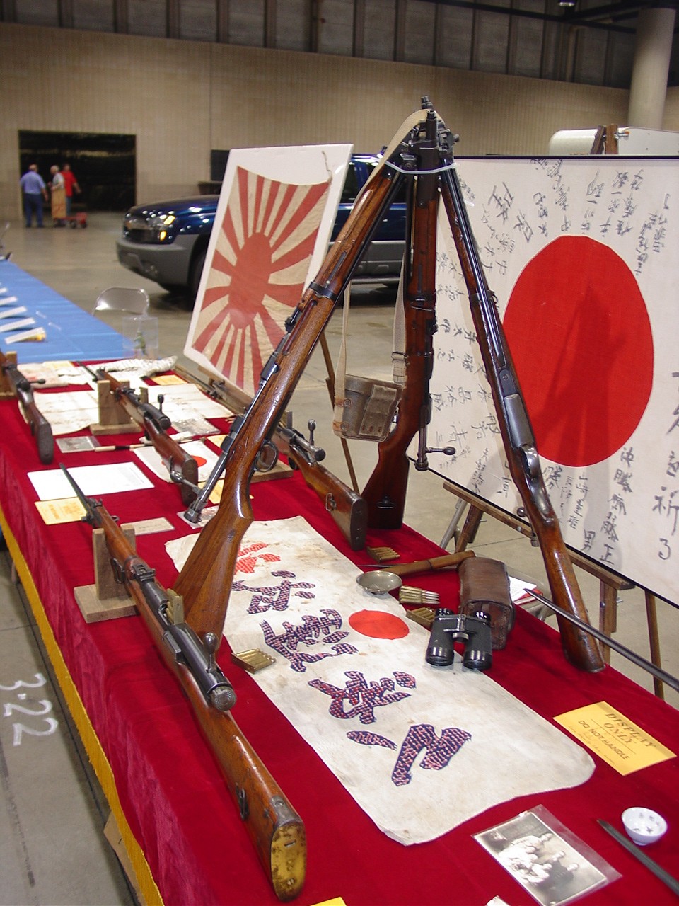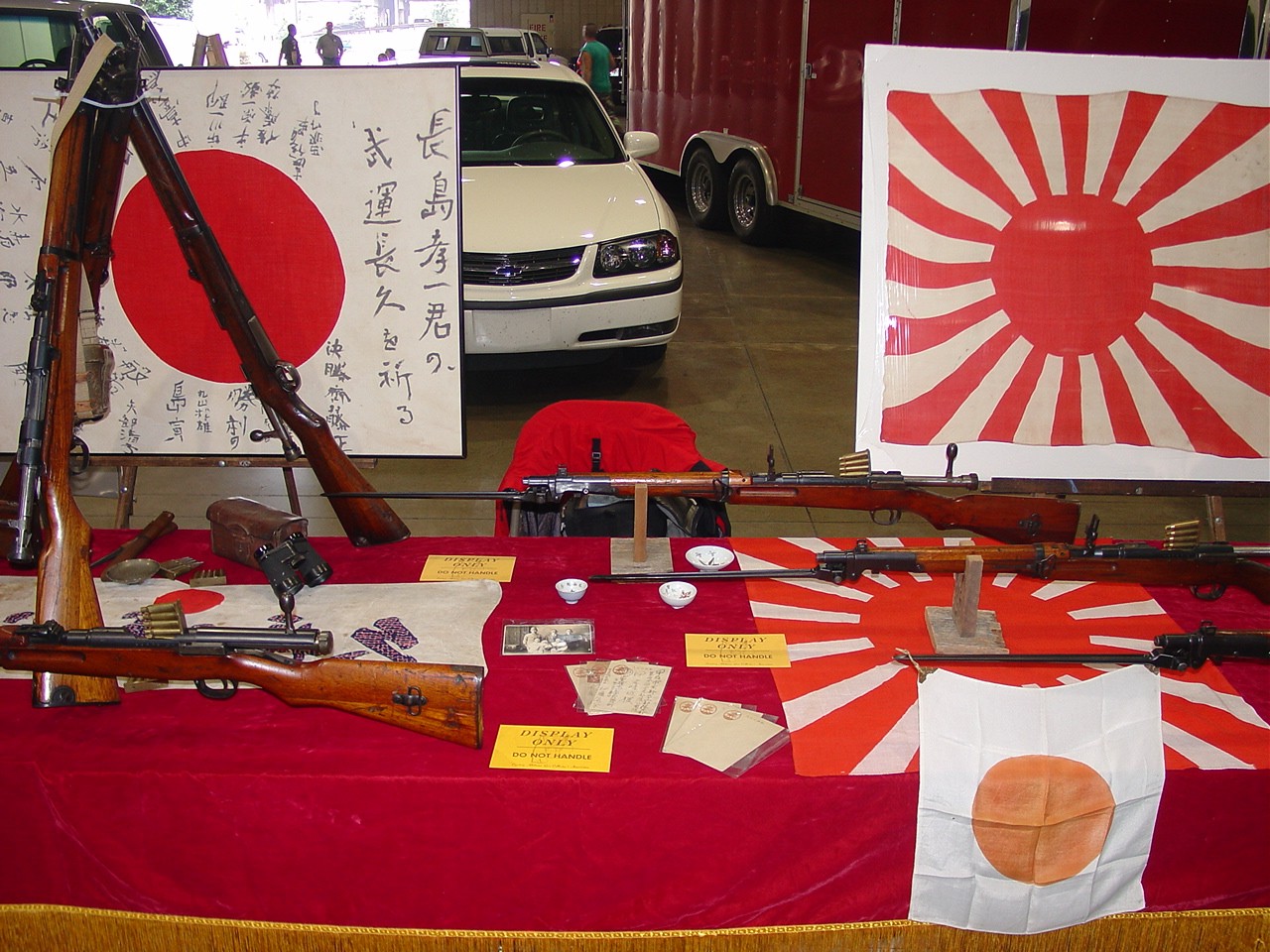 Japanese Type 44 Cavalry Carbines, other military items and accessories in use by the Japanese during World War II. Pictured are all basic variations and models of Type 44 Carbines. These aren't pictures of the finished display but were taken during a break while setting up. Clicking on a picture will open it full size in a new window.